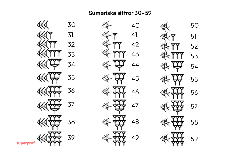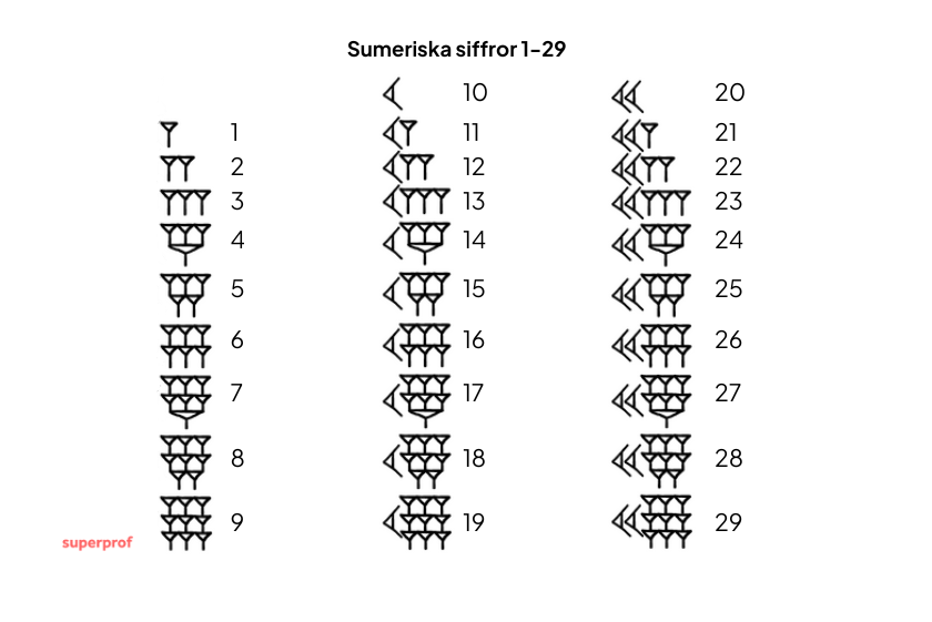 Sumererna hade endast symboler för siffrorna 1, 10, 100 och 1000. Detta innebär att de bara kunde skriva upp till siffran 9999.