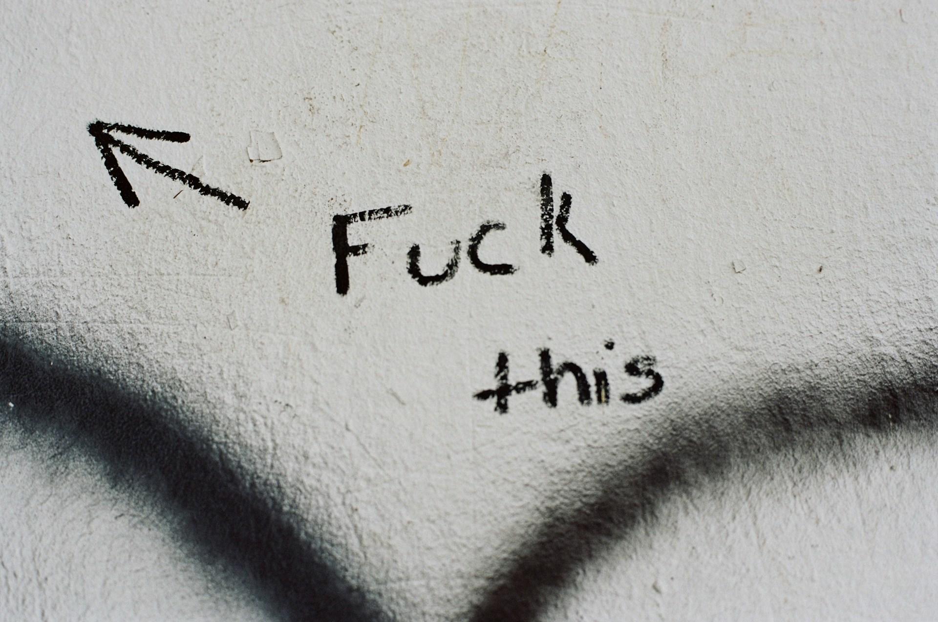 När man använder svordomen "fuck" som i "fuck this" uttrycker man stark frustration, irritation eller avsky mot en situation. Det är ett sätt att säga att man är trött på eller vill ge upp något. Frasen är ofta ett starkt och direkt sätt att visa missnöje eller förakt, och är vanligt förekommande i vardagligt tal, särskilt bland yngre generationer och i informella sammanhang.