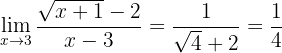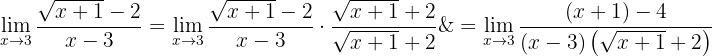 Vi får återigen ett obestämt uttryck, så vi måste omforma det först. Eftersom täljaren innehåller ett rotuttryck multiplicerar vi bråket med täljarens konjugat och delar samtidigt med det: