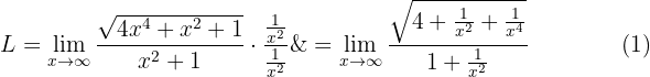 är ett obestämt uttryck. Vi omformar därför igen genom att multiplicera och dividera med monomet av högsta grad (i täljaren eller nämnaren). I detta fall tar vi