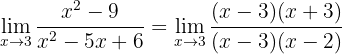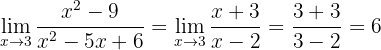 Vi får återigen ett obestämt uttryck. För att lösa det faktorisera vi både täljare och nämnare. Täljaren är en differens av kvadrater; nämnaren kan faktoriseras genom att hitta två tal som multipliceras till 6 och adderas till -5: