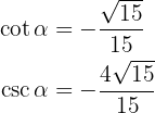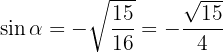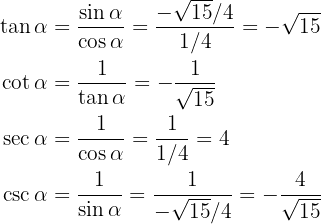270^{\circ} < \alpha < 360^{\circ}[/latex]. Beräkna de övriga trigonometriska funktionerna för vinkeln [latex]\alpha[/latex].